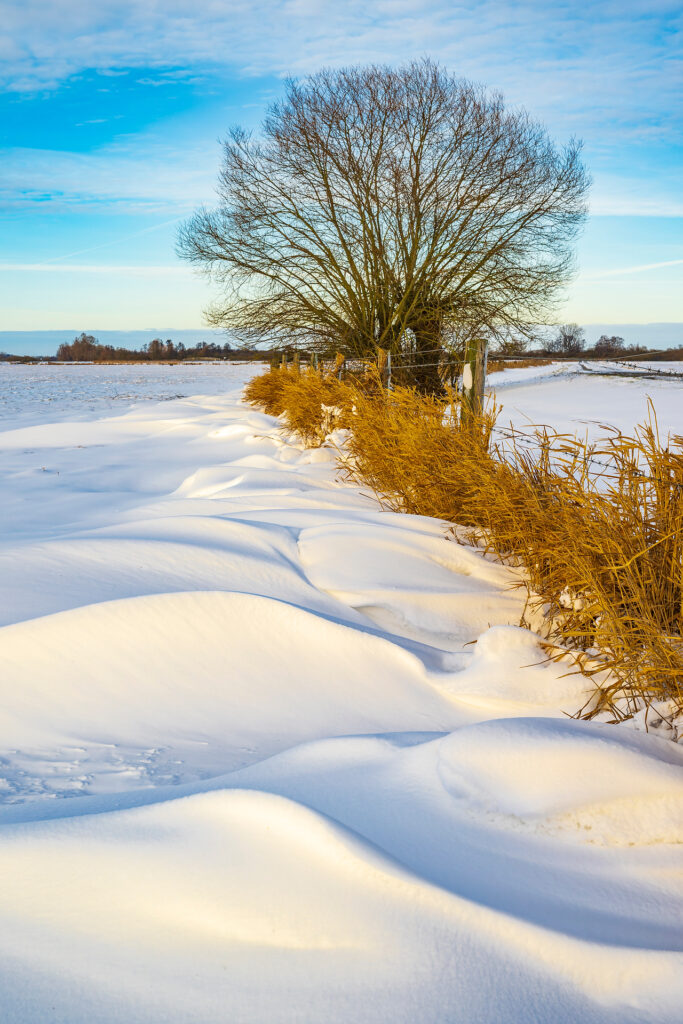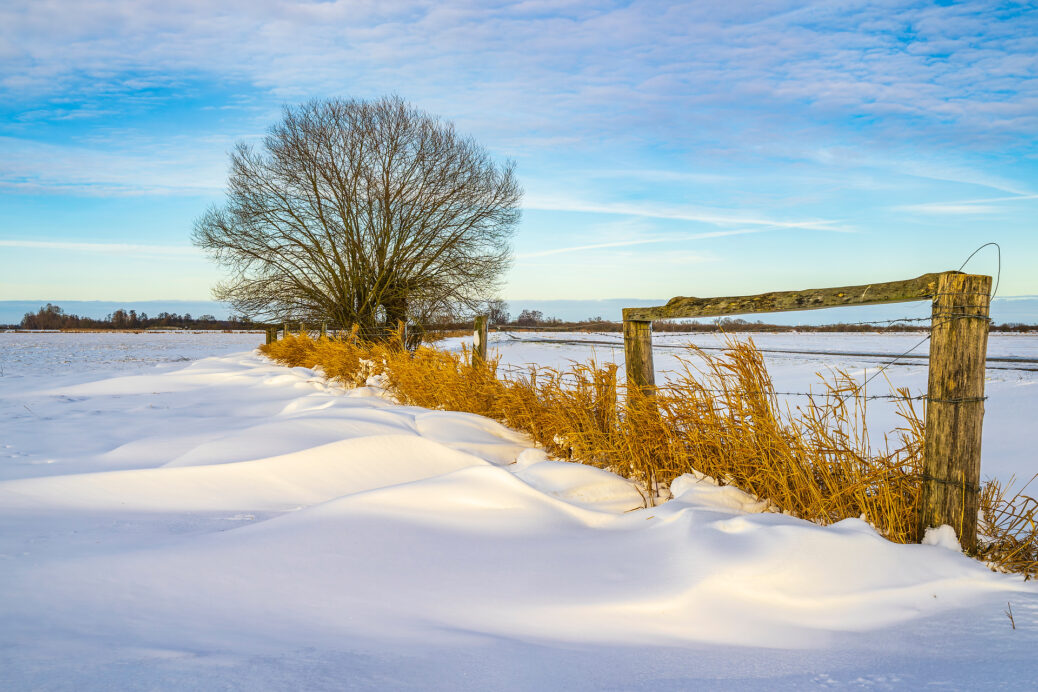 Als nun die Landschaft in ein weißes Winterkleid gehüllt wurde, bot sich die Chance Wintermotive in den genannten Naturräumen aufzunehmen. Ein Ziel war das Ochsenmoor am südlichen Rand des Dümmer. Eigentlich eine unspektakuläre Landschaft. Und so musste ich mir für eine gelungene Landschaftsfotografie etwas einfallen lassen. Dabei war der alte Grundsatz der Bildgestaltung sehr hilfreich: „Vordergrund macht Bild gesund“. Mit der Kopfweide in der Weite der Landschaft war zwar schon ein Motiv gefunden, doch der Baum wirkte ein wenig verloren in der offenen Wiesenlandschaft. Daher entschloss ich mich, den Weidezaun und die Schneeverwehungen in die Bildkomposition prominent einzubeziehen. Das farbige Schilfgras stellt eine Linie dar, die dem Bild Tiefe verleiht und den Blick auf das Hauptmotiv führt. Für die fotografische Umsetzung nutzte ich ein Stativ. Eine leicht Überbelichtung wirkte der Helligkeit des Schnees bei der Belichtung entgegen. Um ausreichend Tiefenschärfe zu erhalten wurde das Bild mit Blende 11 bei rund 35 mm Brennweite aufgenommen.