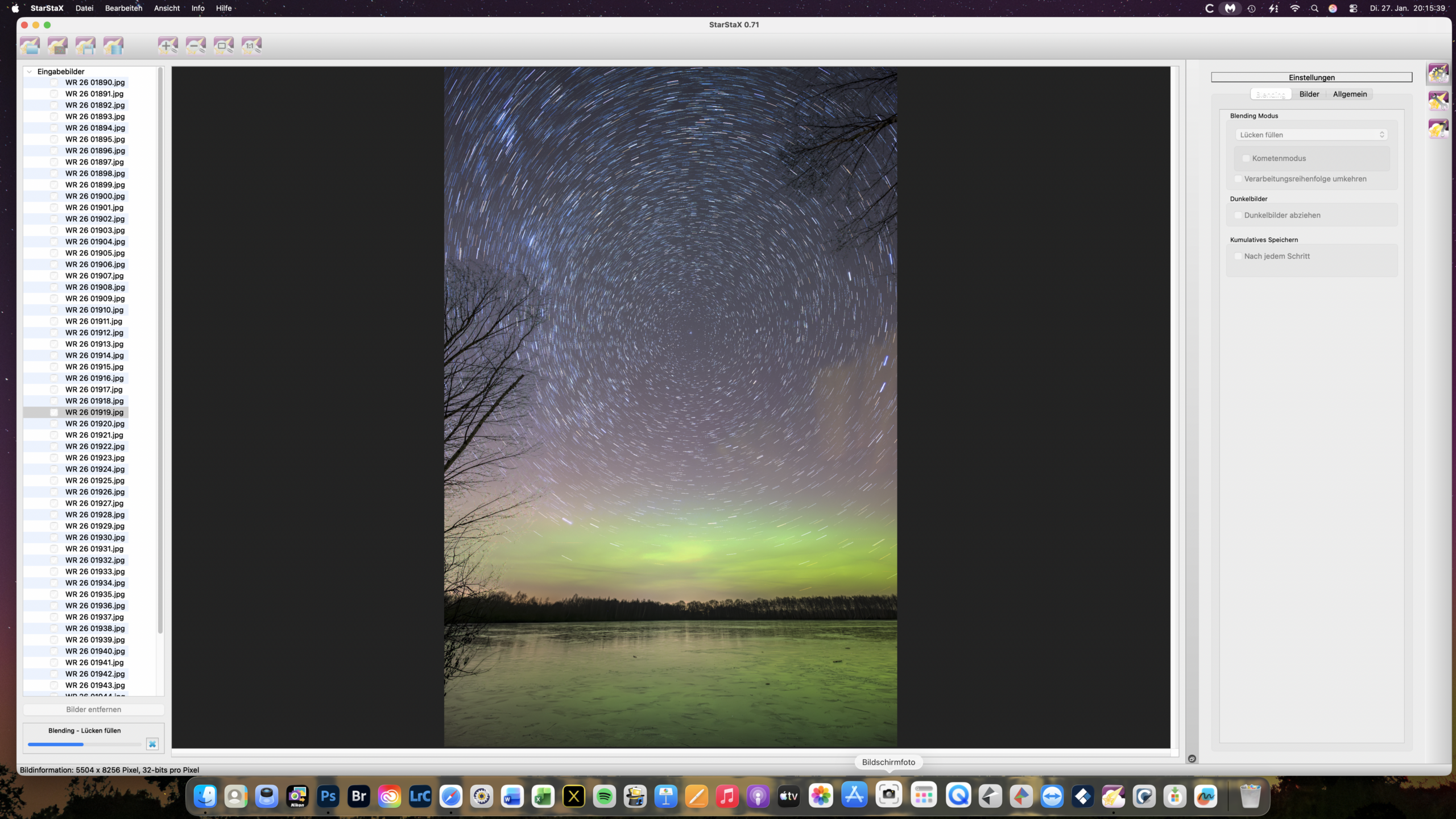 Dann erfolgt die Verarbeitung der Bilder. Man kann live mitverfolgen, wie Schritt für Schritt die Startrails entstehen.