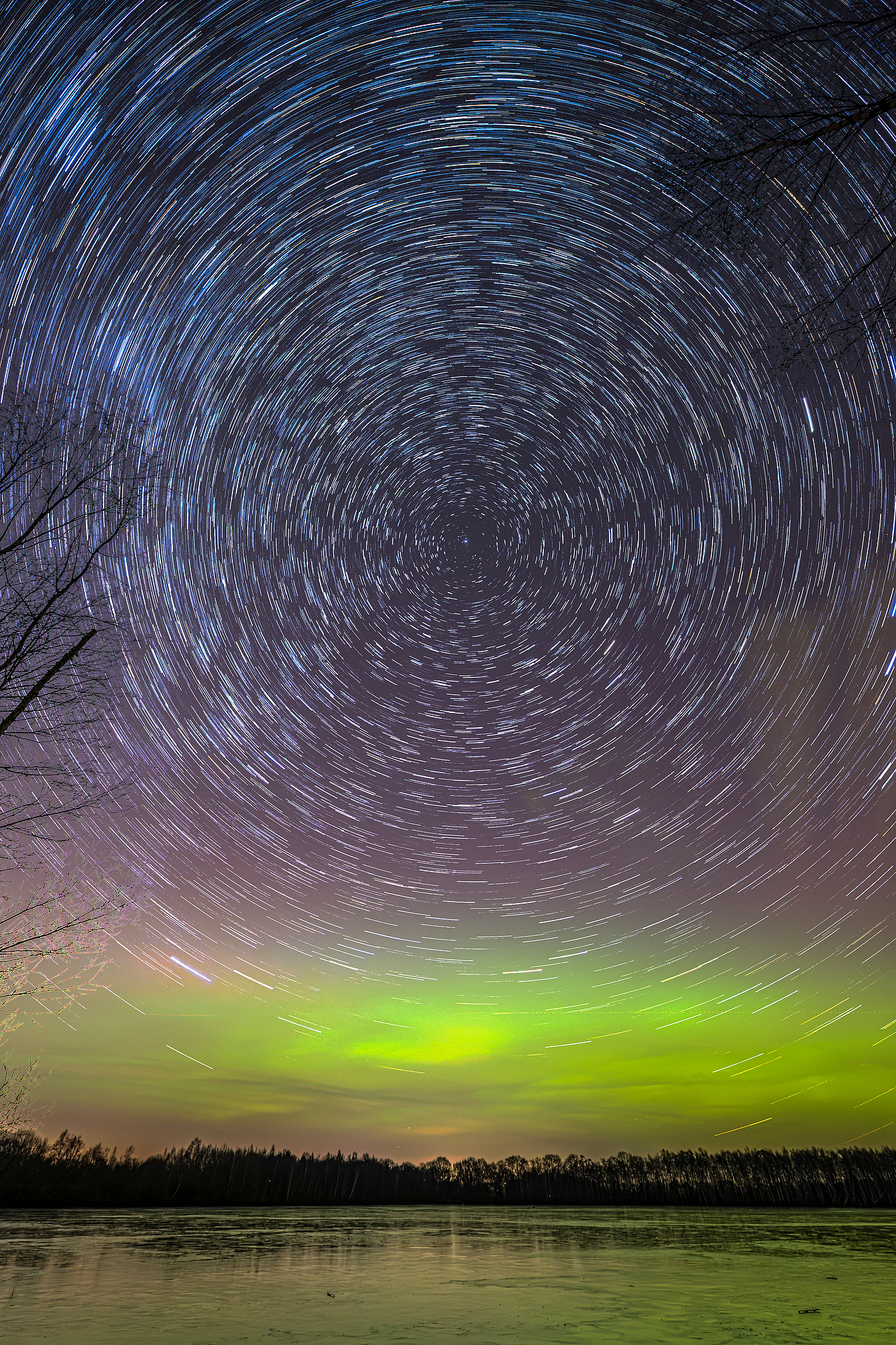 Mein Plan ging jedoch über die Polarlichter hinaus: Ich nahm mir vor, Sternenbahnen (Startrails) zu fotografieren und im Idealfall das Polarlicht darin einzufangen. Dazu stellte ich eine Kamera im Hochformat auf ein Stativ. Bei 14 mm Brennweite richtete ich sie auf den Polarstern aus. Dieser liegt in ungefährer Verlängerung der Erdachse, sodass sich die Erdrotation um ihn als Mittelpunkt darstellen lässt.